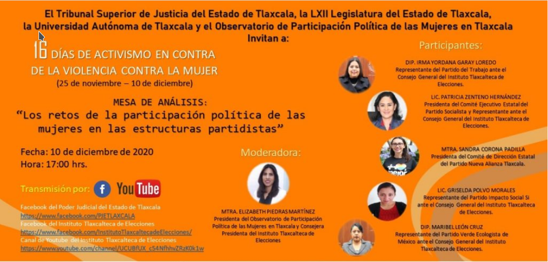 Tlaxcala, Tlax, a 10 de diciembre de 2020 (Redacción).- Con la mesa de análisis “Los retos de la participación política de las mujeres en las estructuras partidistas”, en el que participan el Tribunal Superior de Justicia del Estado (TSJE), la LXIII Legislatura del Congreso del Estado, la Universidad Autónoma de Tlaxcala (UATx) y el Observatorio de Participación Política de las Mujeres en Tlaxcala, concluyen las actividades de los 16 días de trabajo conjunto para contribuir a la erradicación de la violencia contra la mujer.